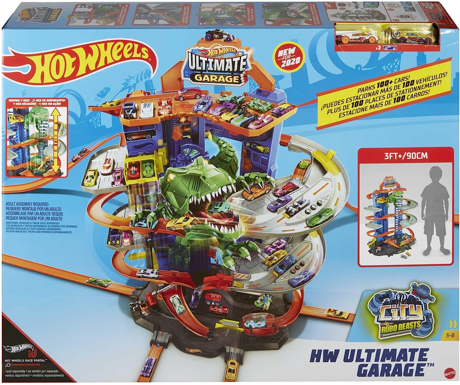 Hot Wheels Toy Car Track Set City Ultimate Garage Moving T-Rex Dinosaur, 100+ 1:64 Scale Vehicle Storage, 3-Ft Tall, 2 Toy Cars